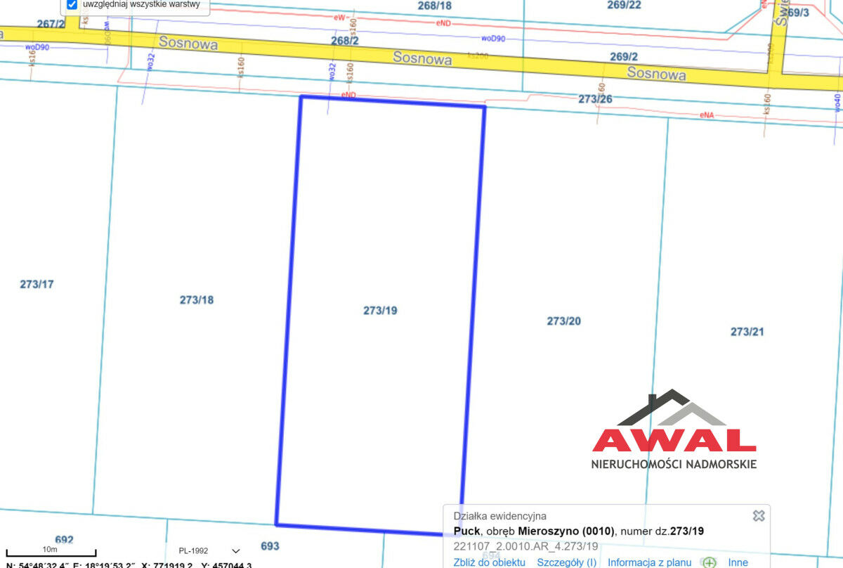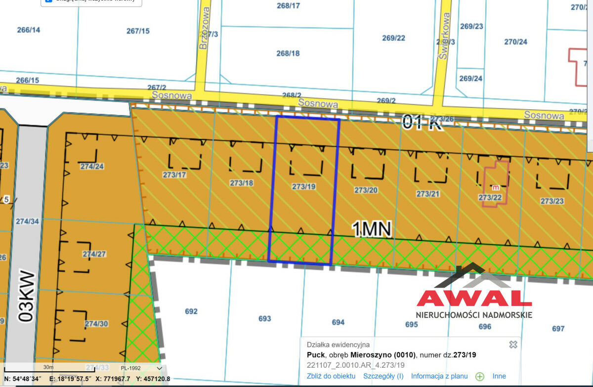 Mieroszyno ul. Sosnowa (odległość ok. 2,8 km w linii prostej do plaży w Jastrzębiej Górze, ok. 2,4 km do Rozewia, ok. 600 m od ul. Puckiej prowadzącej z Pucka z Jastrzębiej Góry, ok. 10 min jazdy samochodem od Władysławowa i tyle samo do Karwi )Na sprzedaż oferujemy atrakcyjną działkę budowlaną o powierzchni 1029 m², położoną w spokojnej miejscowości Mieroszyno, zaledwie kilka minut jazdy od malowniczej Jastrzębiej Góry. Nieruchomość usytuowana jest w otoczeniu zieleni, co gwarantuje ciszę i spokój, a jednocześnie pozwala cieszyć się bliskością nadmorskich atrakcji.